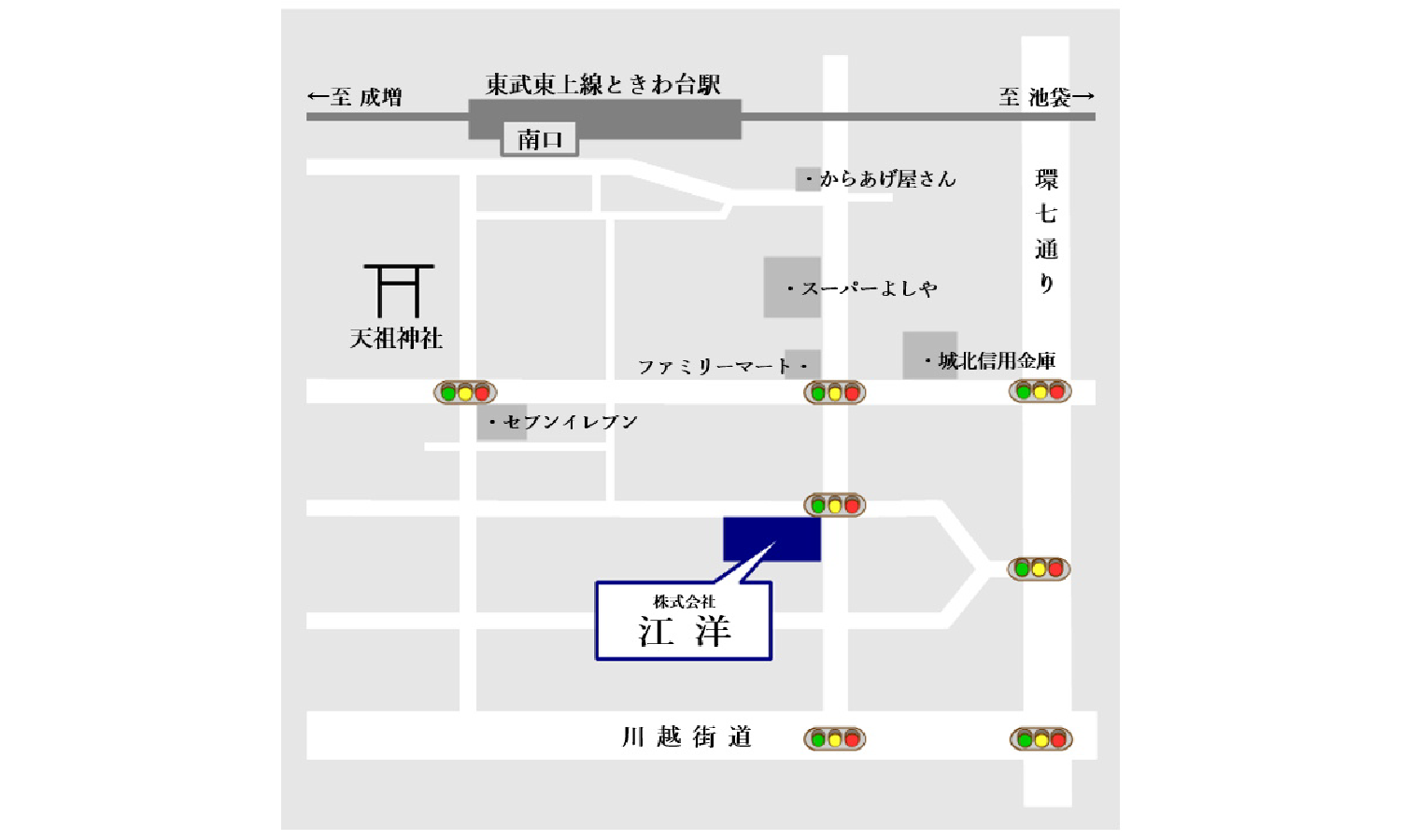 東部東上線「ときわ台駅・南口」を出て左へ進み、二車線道路に出ましたら右へ。